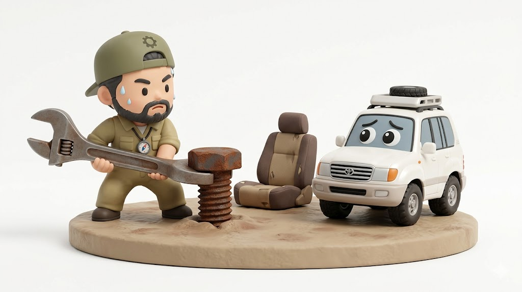 ランクル100の3列目シートは異常なほど重く、長年放置されたフロアの14mmボルトは完全に錆びて固着しています。