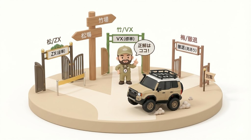 無理して買っても、維持費で苦しむだけです。新車は諦めて、熟成された中古のプラド150系を狙うか、もう少し頭金を貯める期間を作りましょう。
