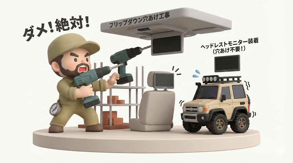 「天井吊り下げ(フリップダウン)」と「ヘッドレスト装着」の2択になりますが、ランクル250のリセールバリュー(資産価値)を気にするなら、答えは明確です。