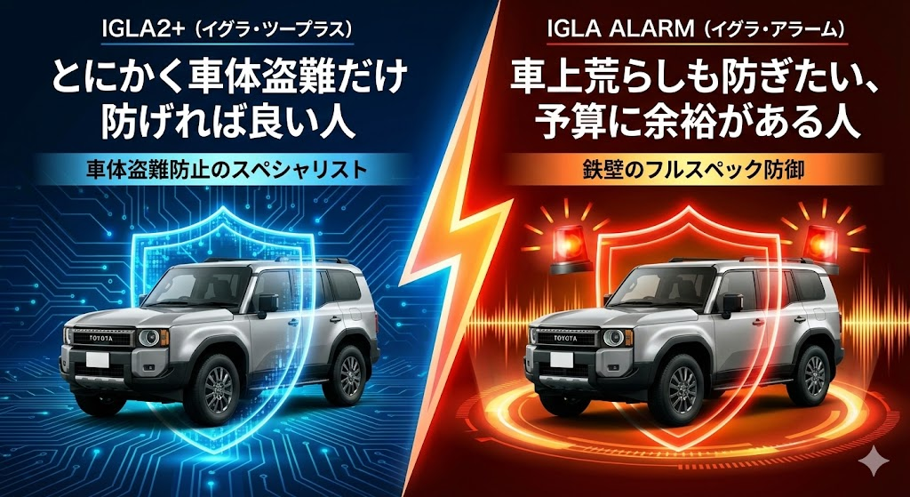 予算が潤沢なら「IGLA ALARM」ですが、ランクル250の購入で資金がカツカツなら「IGLA2+」で十分です。最も避けるべきは「車体ごと盗まれること」だからです。