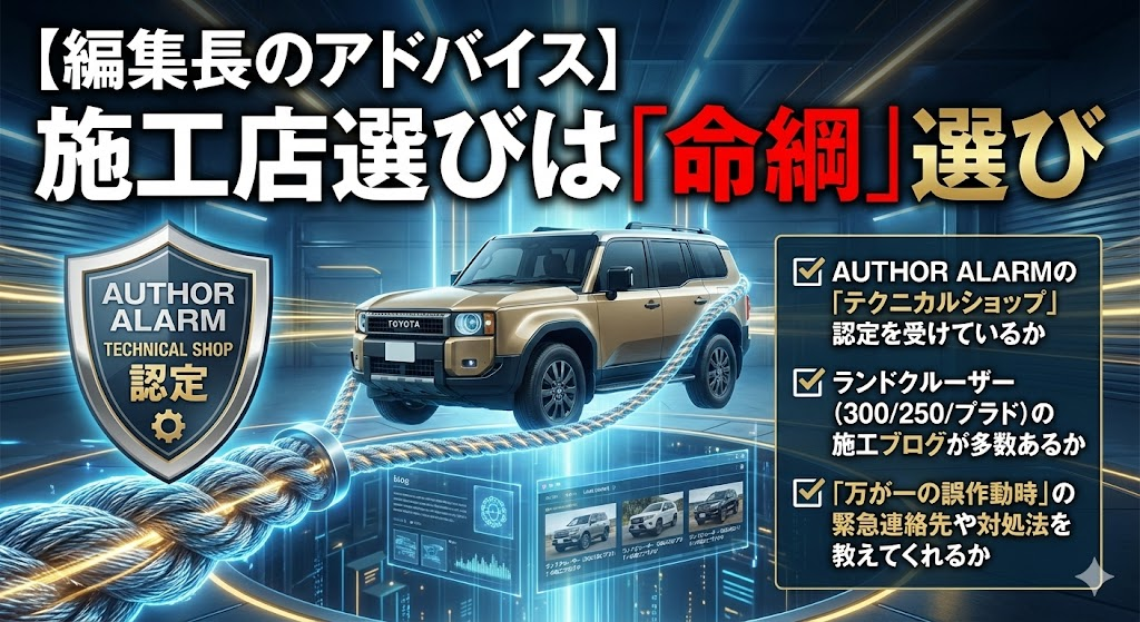 必ずメーカー(AUTHOR ALARM)の「テクニカルショップ(認定店)」を選んでください。正規代理店の中でも、特に「ランクル施工実績」をブログ等で公開しているお店一択です。