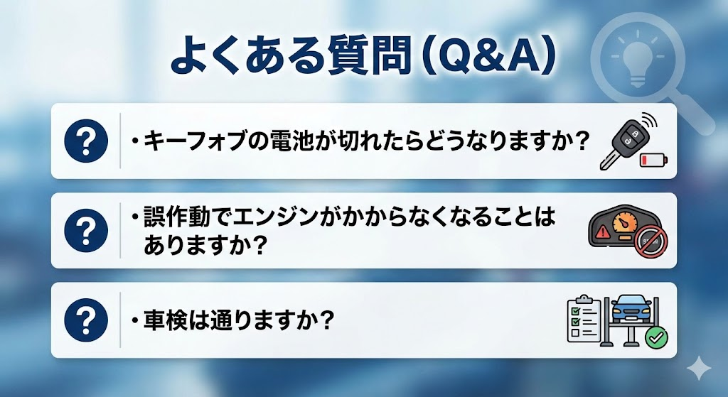 製品自体の不具合は稀ですが、「キーフォブの電池切れ」や「電波干渉(スマホと同じポケットに入れている等)」で認証できず、エンジンがかからないケースが多発しています。これは故障ではなく、ユーザー側の運用ミスです。スマホとキーフォブは別のポケットに入れる癖をつけてください。