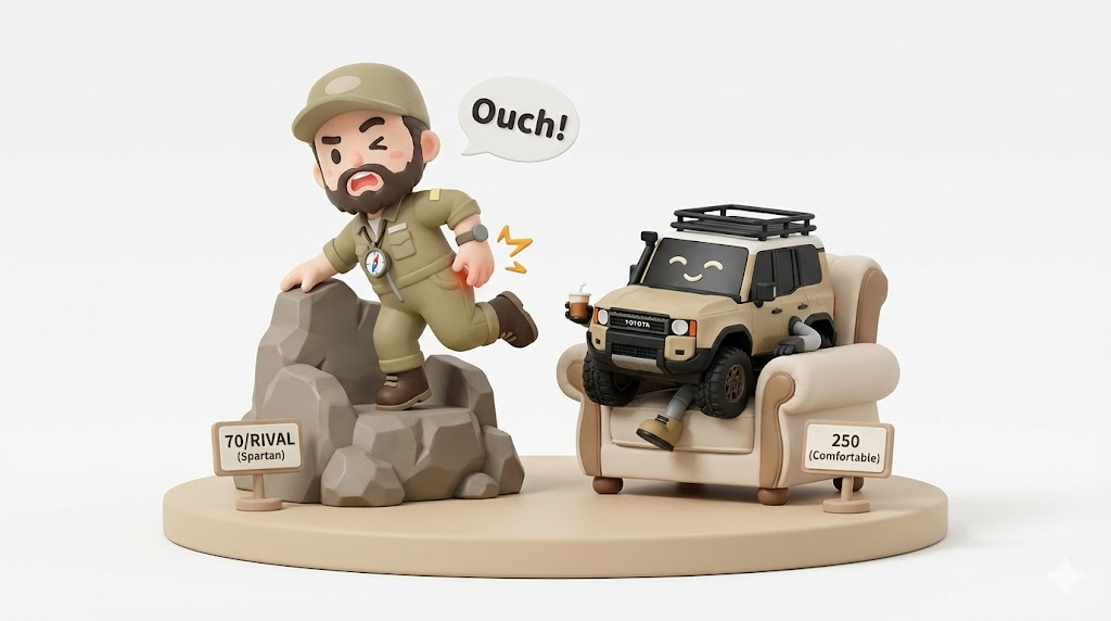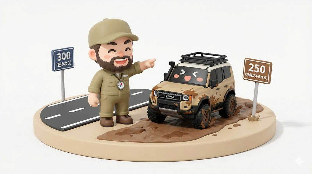 走破性(メカニズム)は互角ですが、精神的なリミッターが違います。1000万円超えの300を岩場にぶつけられる人は稀です。樹脂バンパーで武装した250なら、多少の傷は勲章。結果的に、250の方が「ランクルらしい遊び」を楽しめます。