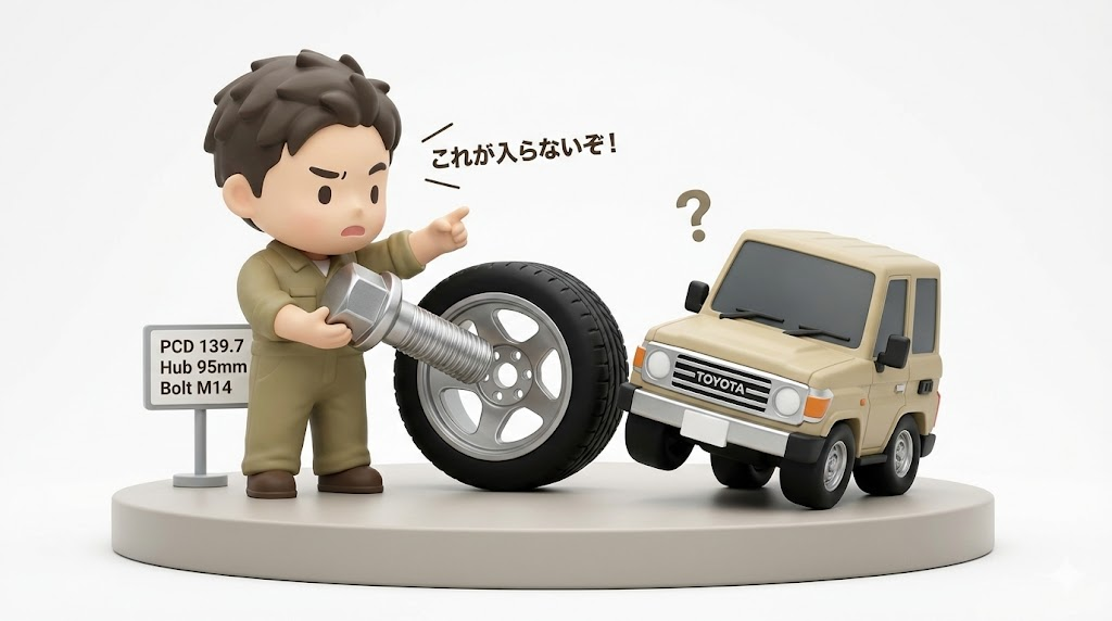 - 絶対ルール: PCD139.7/6Hに加え、「M14ボルト」対応必須。プラド用は装着不可。