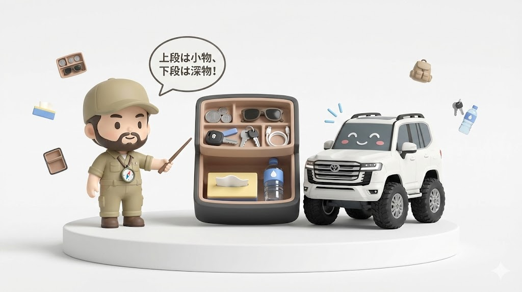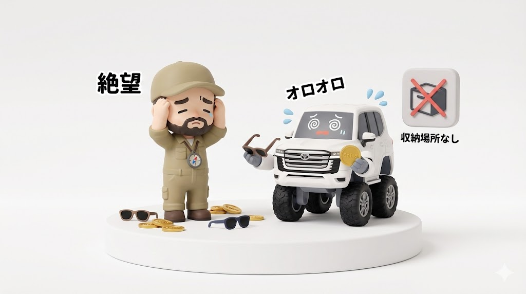 底の方に小銭やSDカードが落ちてしまったら、運転中に拾うのは物理的に不可能。まさにブラックホール。この「無駄な深さ」をどう活かすかが、ランクル300収納攻略の最大の鍵となります。