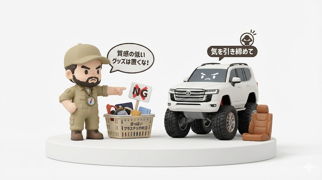 収納グッズを選ぶ時、多くの人が「機能性」や「安さ」だけで選びがちですが、ランクル300の場合は「内装との調和(質感)」を最優先してください。