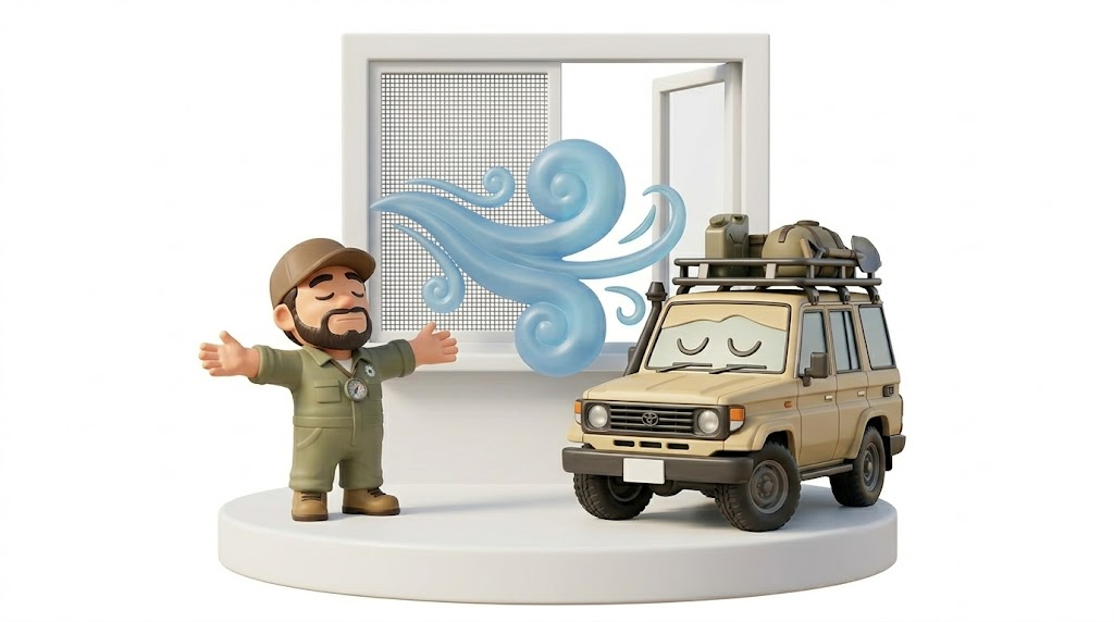 ランクル70車中泊の質を変える「網戸(バグネット)」との併用術