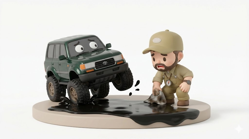 このグリス漏れを放置すると、自宅の駐車場に落ちにくい「黒い油汚れ」が付着します。もしあなたが賃貸にお住まいだったり、奥様が玄関周りの美観を気にされる場合、このシミ一つで「ランクル売却」の危機的家族会議に発展します。見つけ次第、即修理が鉄則です。