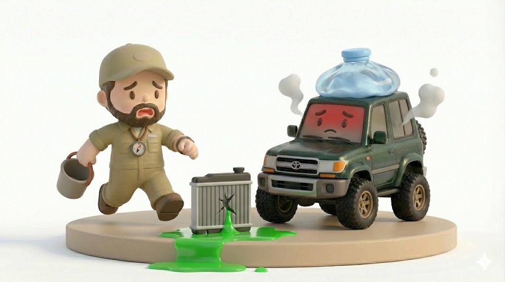 水回りも要注意です。ランクル80のラジエーターは、アッパータンクが樹脂(プラスチック)で作られています。経年劣化でこの樹脂が変色(茶色化)し、最終的には水圧に耐え切れず割れます。